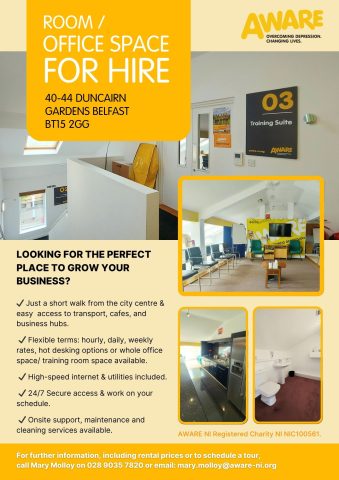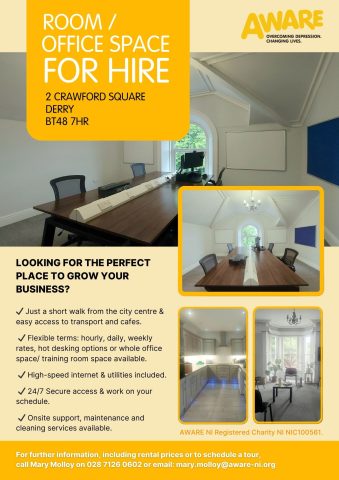 AWARE NI are pleased to offer office space and training/event room hire on a casual or more permanent basis at our Duncairn Gardens Belfast and Crawford Square, Derry-Londonderry premises. We would particularly welcome enquires from businesses operating in the wellbeing / C&V sector whose services may be of benefit to our support service users or align with our vision, mission and values.
